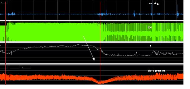 Early mobilisation started 3 days later. At this time blood pressure was stable without catecholamines but she showed tachycardic episodes at night. During mobilisation the patient experienced recurrent episodes of light headedness. 4 days after mobilisation the patient suffered a presyncope in sitting position.