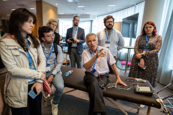 Afterwards, the attendees visited the hospital in two groups and were guided through the area of electrophysiology and neuropathology where muscle and nerve biopsies are performed by neurologists. This was followed by a walk through the neurological ward covering stroke patients with non-invasive monitoring, next to continuous EEG monitoring as well as the treatment of patients with general neurological disorders. In the Clinical Trial Area, the participants visited the Cerebral Hemodynamics Laboratory with Prof. Oliveira as Head, demonstrating a self-examination of the carotid artery as well as the medial cerebral artery with Doppler and Duplex sonography. Furthermore, he presented the opportunities of continuous intraoperative ultrasound monitoring in patients. The hospital visit ended in the impressive library where drinks and Portuguese snacks were offered.
