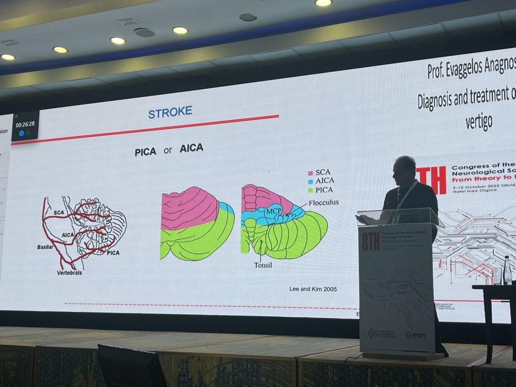 The first lecture, delivered by Prof. Evangelos Anagnostou (Greece), focused on the diagnosis and treatment of acute vertigo. His presentation emphasised the crucial role of clinical examination in differentiating peripheral from central causes of vertigo, highlighting that neuroimaging is not always the most appropriate initial approach. During the subsequent workshop, Prof. Anagnostou demonstrated the art of the bedside neuro-ophthalmological and neuro-otological examination techniques, illustrating how careful eye movement observation and simple maneuvers can provide essential diagnostic insights.